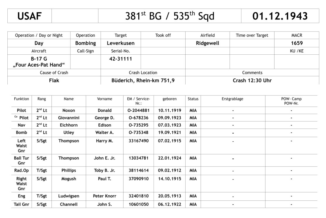 Nachdem die B-17 "Four Aces-Pat Hand" ihre Bomben auf das Ziel Leverkusen abgeworfen hatte, beobachteten mehrere Augenzeugen aus anderen Flugzeugen, das die Maschine zurückfiel und an Höhe verlor. Sie flog mit offener Bombenklappe, aber mit funktionierenden Motoren und drehenden Propellern aber schaffte es nicht, am Wendepunkt nach Westen mit dem zurückfliegendem Bomberstrom mitzuhalten. Sie verlor immer mehr an Höhe, bis sie in der tief hängenden Wolkendecke verschwand. Es wurden auch keinerlei Fallschirmspringer gesichtet...