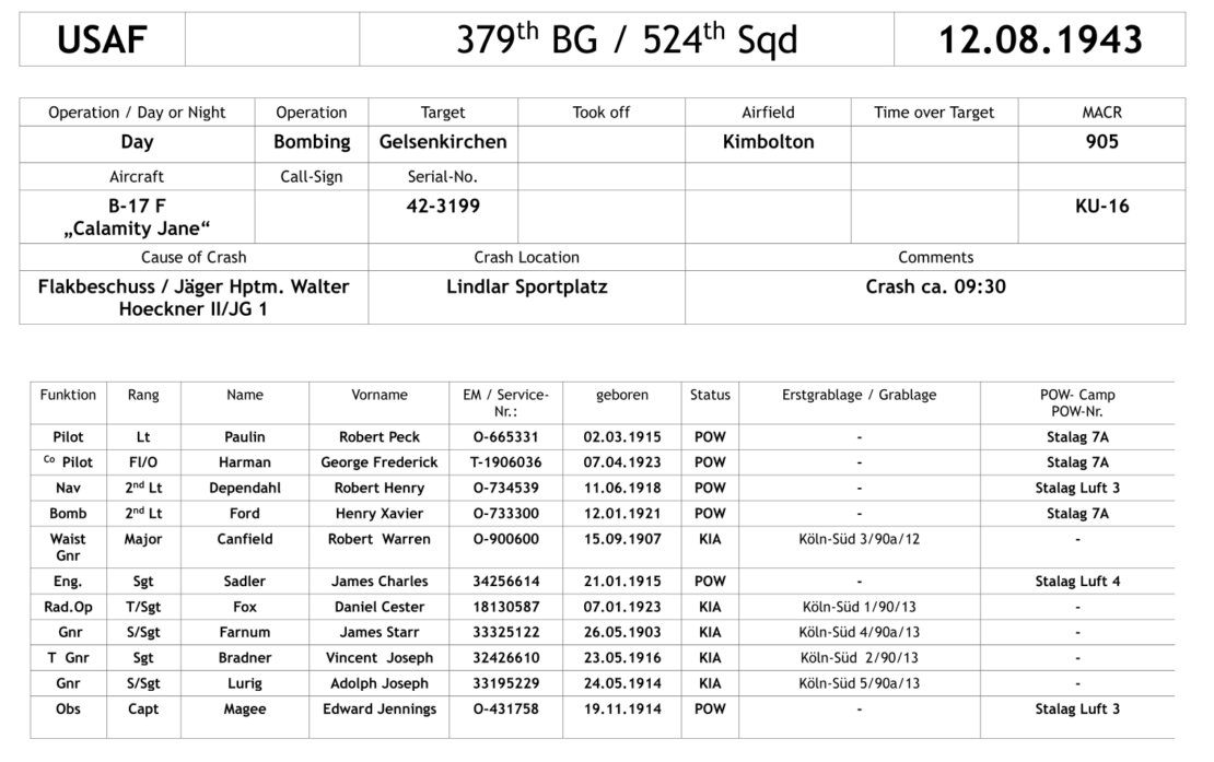 Nach dem Bombenabwurf auf Gelsenkirchen befand sich die „Calamity Jane“ auf dem Rückflug zu ihrem Heimatflugplatz in Kimbolton in England. Nachdem die Maschine schon beim Anflug auf das Ziel von heftigen Flakfeuer begleitet wurde, hatten es jetzt Deutsche Kampfflugzeuge auf sie abgesehen. Hptm. Walter Hoeckner nahm die B-17 ins Visier und traf mit seinen 20mm-Geschossen die Nase des Flugzeugs. Major Canfield wurde dabei tödlich getroffen, Captain Magee wurde an der Schulter getroffen, sein Arm war gebrochen. Ein weiterer Gunner wurde ebenfalls durch den Beschuss getötet.