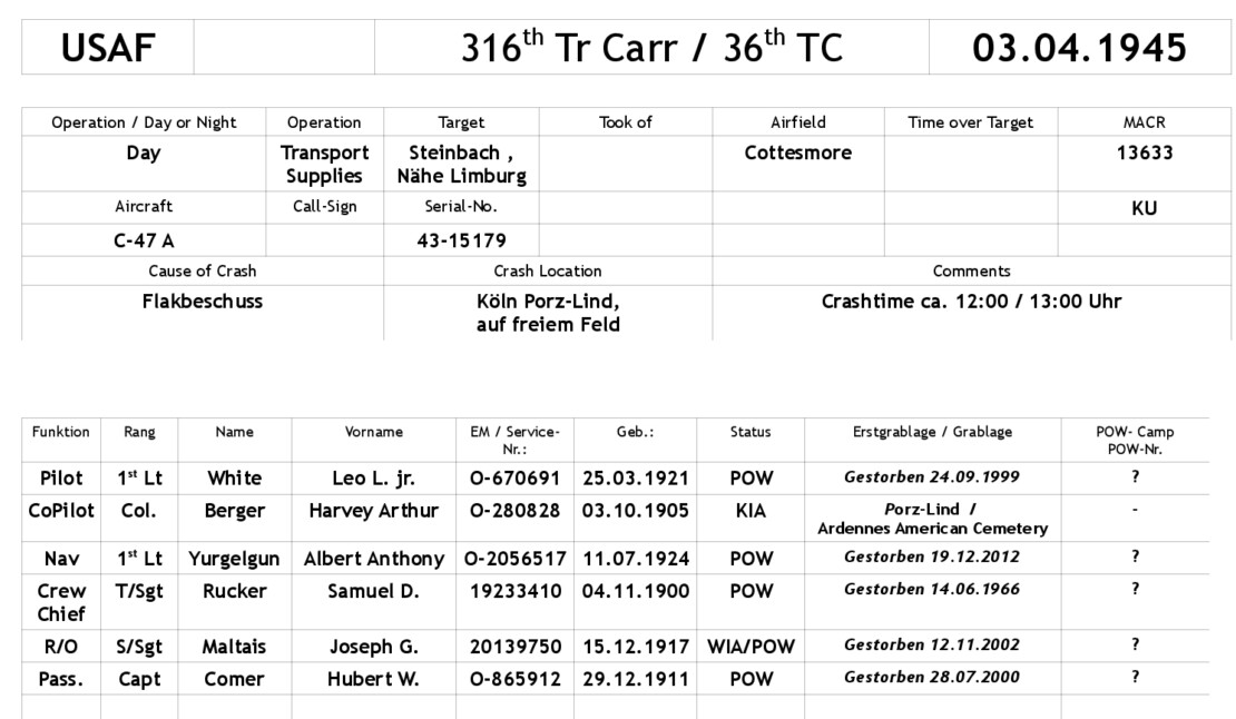 Die C-47 43-15179 befand sich auf einem Versorgungsflug von Cottesmoore in England nach Steinbach in der Nähe von Limburg.