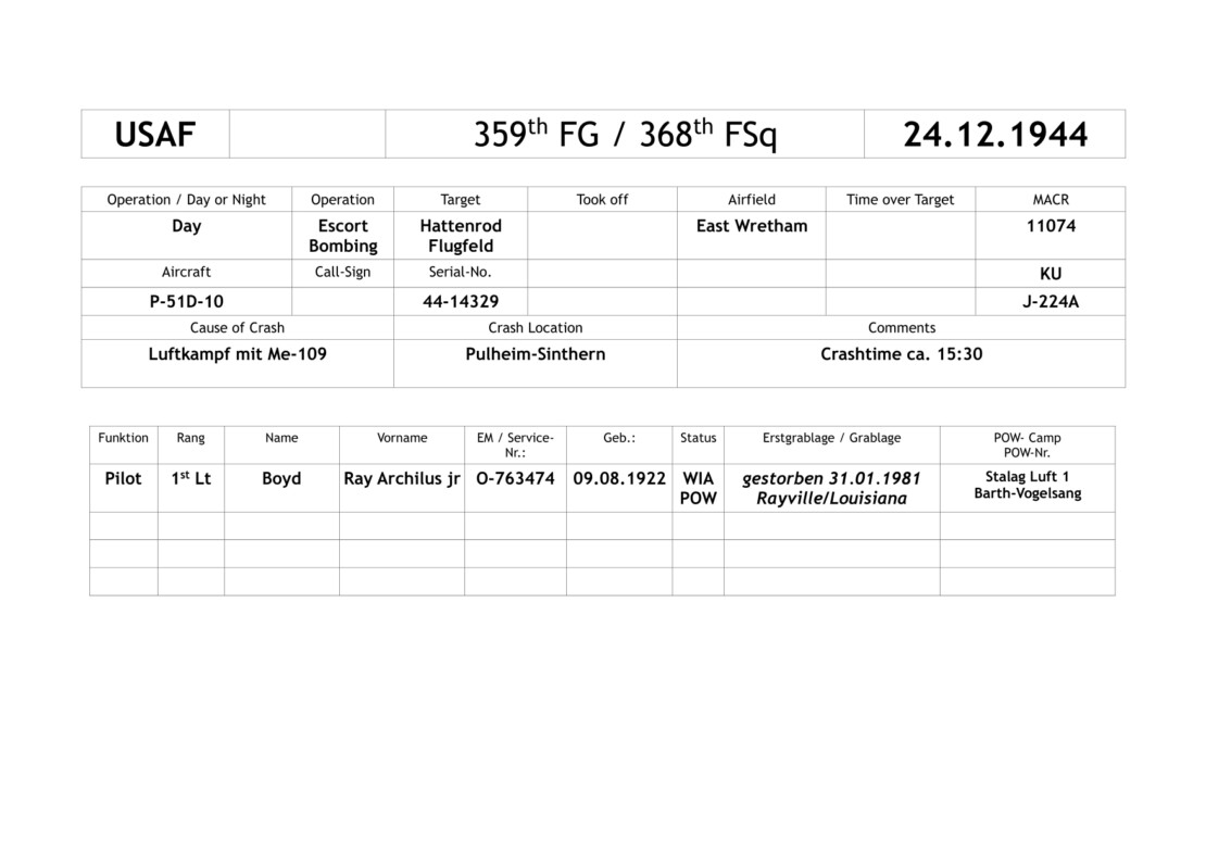 Bei einem Escort-Einsatz zur Bombardierung des Flugfeldes Hattenrod bei Gießen wurde 1st Lt. Ray Boyd über Köln von deutschen Jagdflugzeugen angegriffen. Lt. Boyd hatte diese Flugzeuge zuvor irrtümlich als P-51 „Mustangs“ identifiziert und dies auch so an die drei anderen Maschinen, die sich bei ihm befanden, gemeldet.
