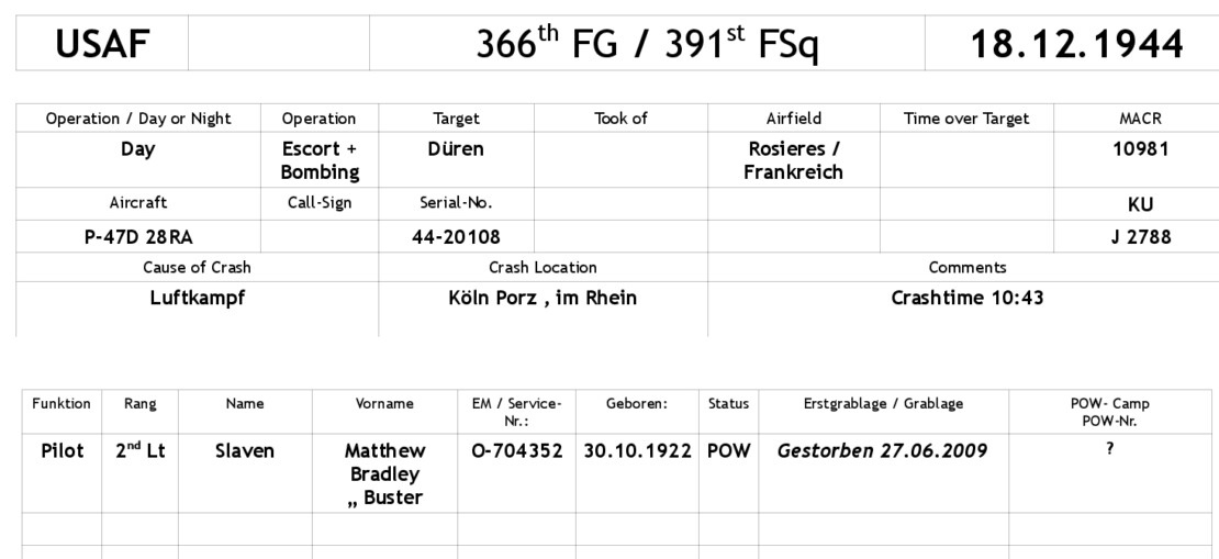 Die Maschine von 2nd Lt. Buster Slaven wurde getroffen und geriet in Brand. Er rettete sich mit dem Fallschirm und geriet in deutsche Kriegsgefangenschaft. Das Flugzeug stürzte bei Köln-Porz in den Rhein.