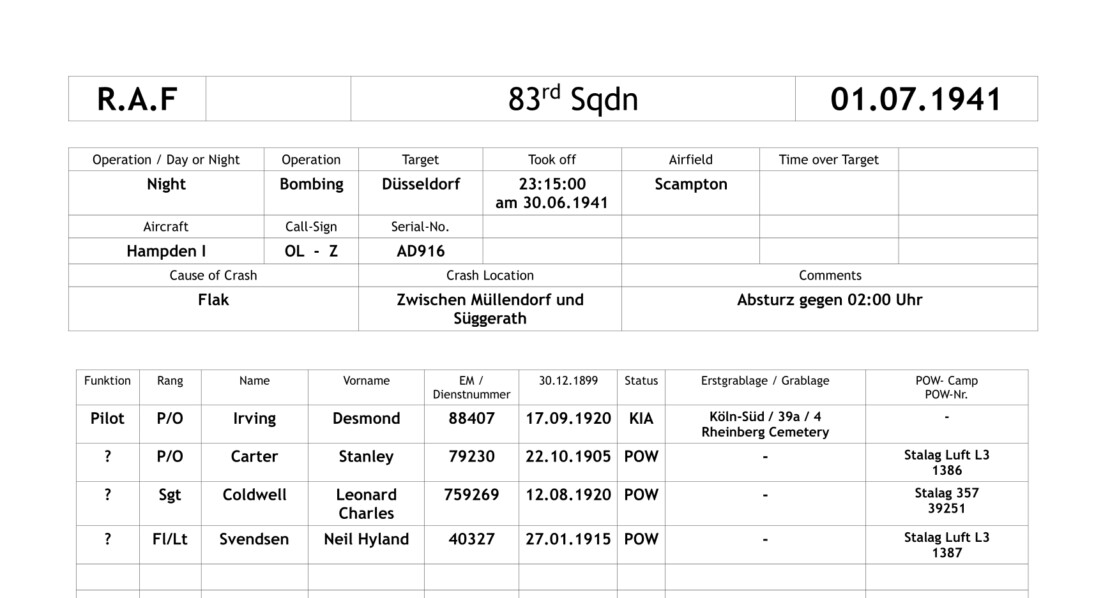 Der Pilot, Pilot Officer Irving Desmond, kam bei dem Absturz ums Leben und wurde auf dem Kölner Südfriedhof beigesetzt.