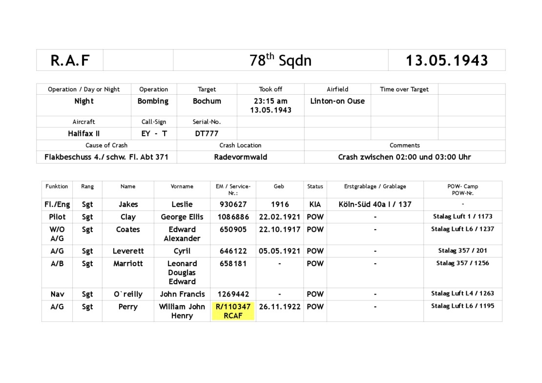Der Flugingenieur, Sergeant Leslie Jakes , kam wohl als Letzter aus der Maschine, jedoch öffnete sich sein Fallschirm nicht und er stürzte ungebremst zu Boden. Mit gebrochenem Halswirbel wurde er östlich von Radevormwald geborgen und am 19. Mai 1943 auf dem Kölner Südfriedhof beerdigt.