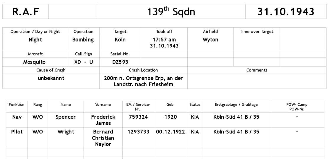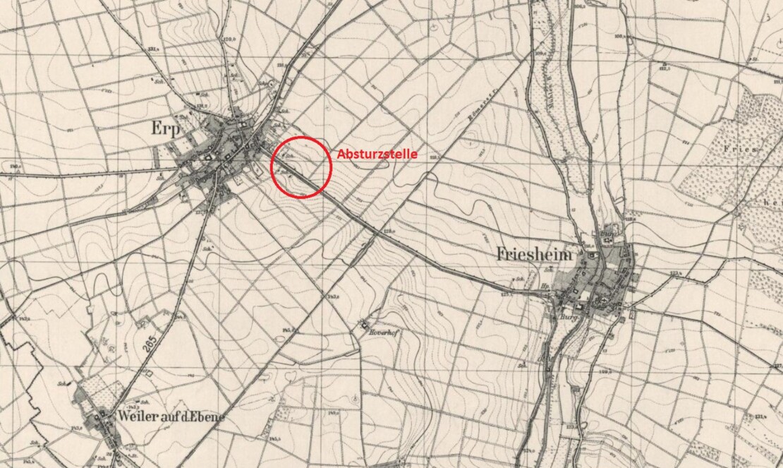 Gesichert ist, dass die Maschine 200 Meter von der Ortsgrenze zu Erp, an der Landstrasse Erp-Friesheim, auf freiem Feld abstürzt. Die beiden Besatzungsmitglieder werden dabei getötet und später auf dem Kölner Südfriedhof bestattet.