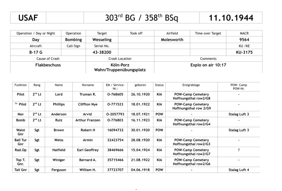 It was hit between the first and second engine, caught fire immediately and went into a steep descent. At an altitude of about 15,000 feet, the aircraft exploded and crashed on the edge of the military training area in Porz-Wahn.
