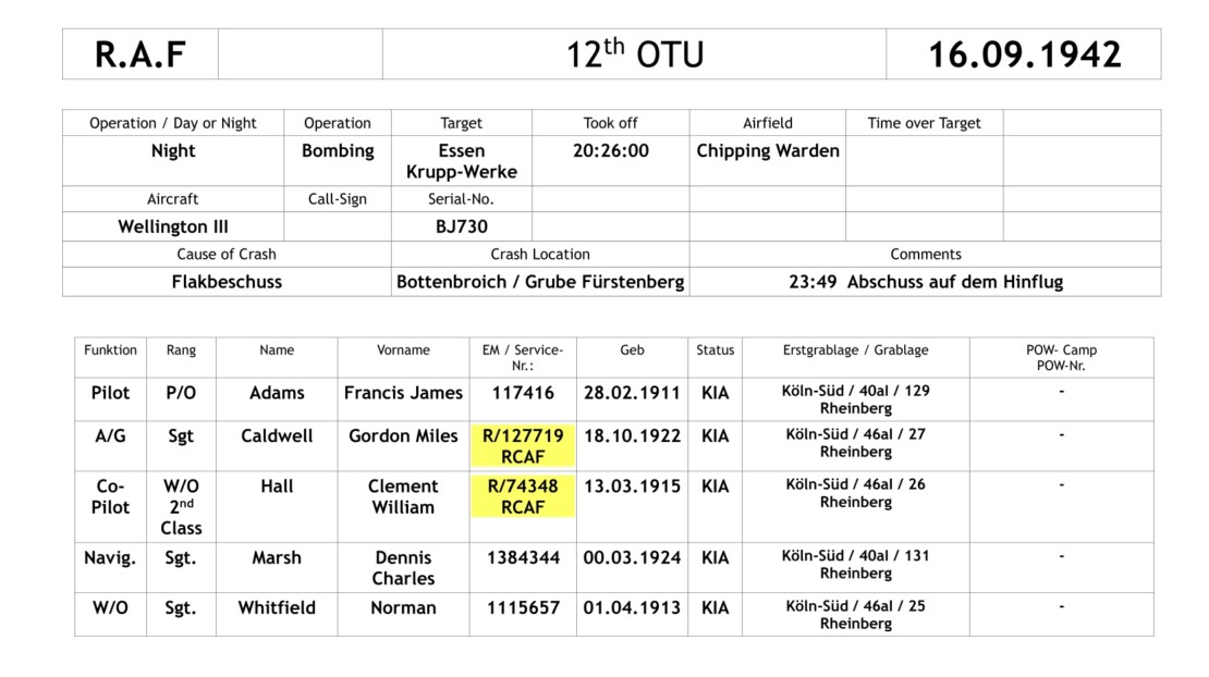 Among them was the Wellington III, BJ730. It was hit by anti-aircraft fire and crashed near Bottenbroich, about 700 metres from the "Fürstenberg" open-cast mine.*