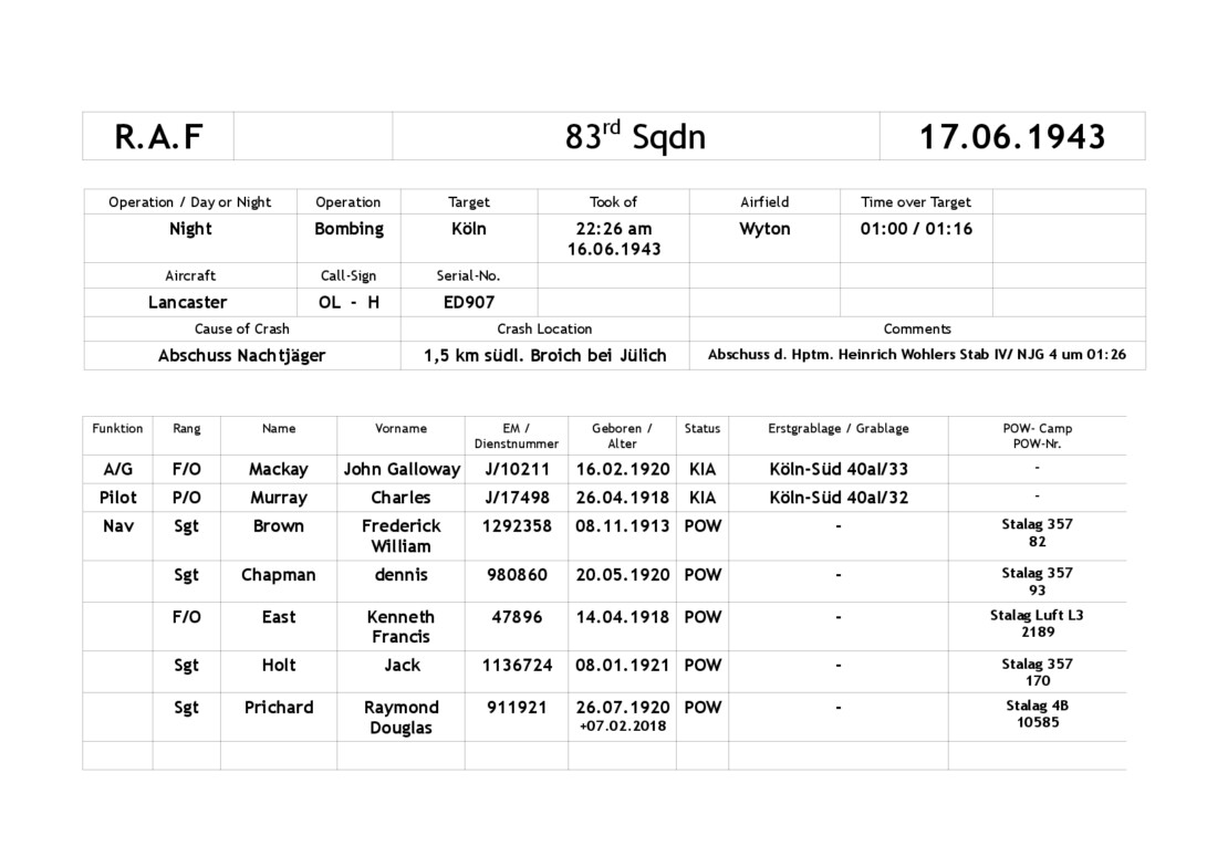 On the return flight from the bombing raid on Cologne, the Lancaster ED907 came under heavy and light anti-aircraft fire and was also attacked by night fighters. Captain Heinrich Wohlers of Stab IV/ Nachtjagdgeschwader 4 (IV/NJG 4) was credited with shooting down the Lancaster, which crashed at Broich near Jülich at 01:26.