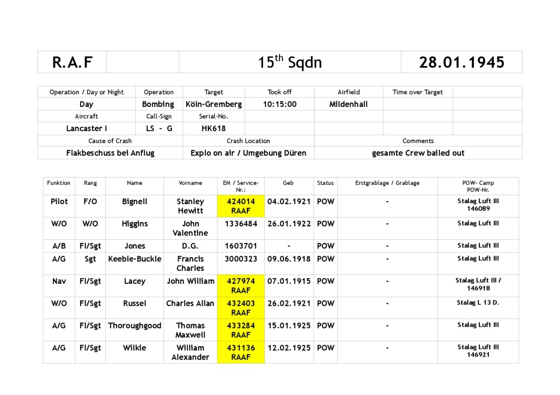 The crew members came down in the area around Düren and were all taken prisoner of war by the Germans.