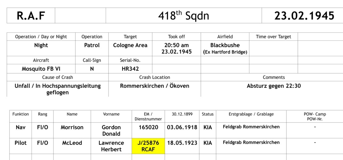 The Mosquito HR342 was on a patrol flight to the area around Cologne. In the Rommerskirchen area, it grazed a power line while flying low, crashed in an open field between Ökoven and Sinsteden and burned out completely.