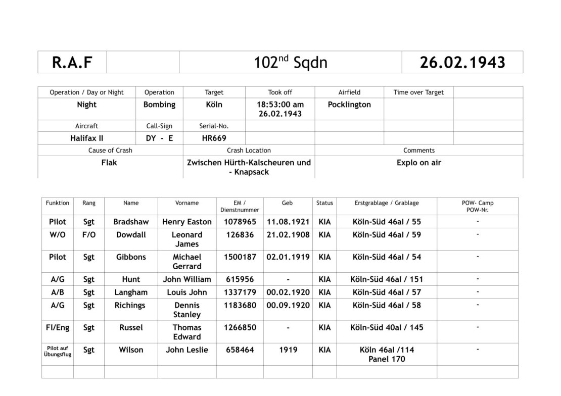 During the approach to the Cologne bombing target, the Halifax HR669 was fired on by several anti-aircraft batteries. A projectile hit the open bomb bay and a huge explosion shredded the aircraft in mid-air. The wreckage and the crew fell to the ground in a wider radius between Hürth-Kalscheuren and Knapsack.