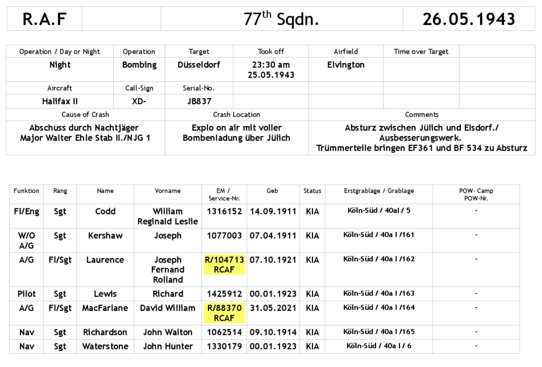 All three aircraft crashed near Jülich and none of the crew members survived the disaster. Their bodies, some of which were completely mangled, were recovered from a wide area around Jülich and buried in Cologne's Südfriedhof cemetery.