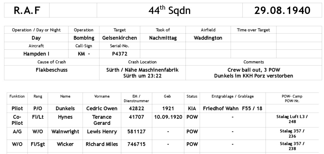 The pilot, Pilot Officer Cedric Owen Dunkels, was severely injured in the hip by flak fragments and was taken to St.Josefs-Hospital in Porz-Wahn, where he died of his injuries at 01:20 on the same day. He was buried in the Catholic Cemetery in Wahn and exhumed on 12.11.1947 and laid to rest in Rheinberg Cemetery.