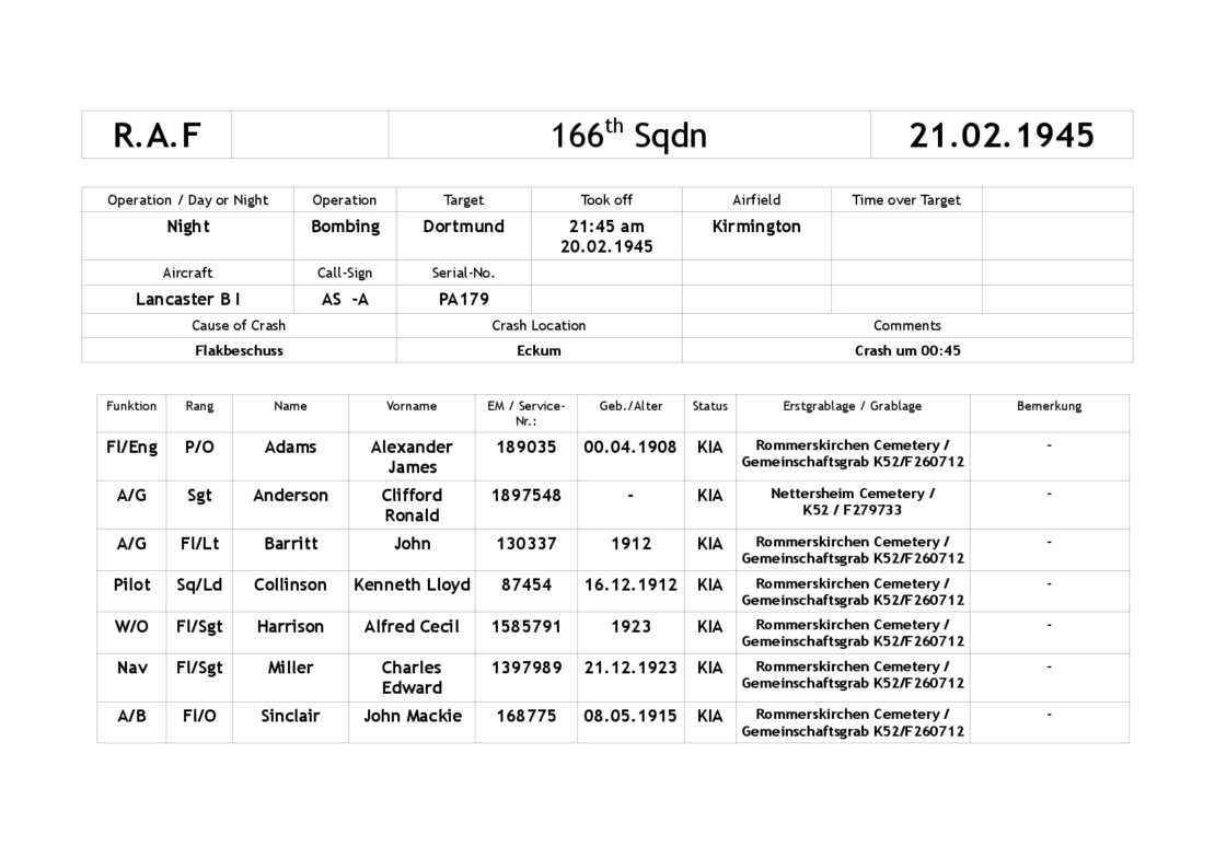 The dead crew was recovered and buried in a common grave at the cemetery in Rommerskirchen. Only Sgt Anderson was buried at the cemetery in Nettesheim.