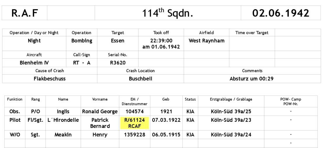 Pilot Fl/Sgt. Patrick Bernard L`Hirondelle