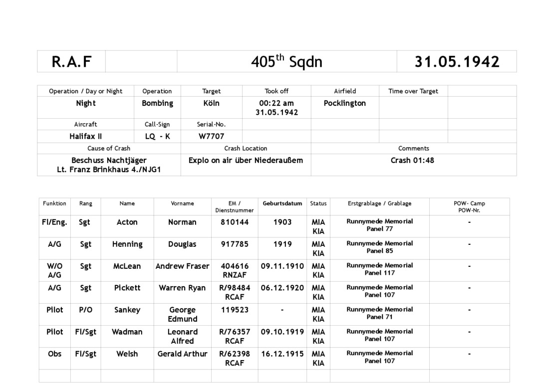 During the approach to the 1000-bomber raid on Cologne on the night of 31 May 1942, Halifax II, W7707 was shot at by the German fighter pilot Lt. Franz Brinkhaus in his Bf 110E. He attacked the aircraft from the port side, firing from a distance of 70 to 30 metres and hitting the fuselage. The bomb exploded inside the Halifax and tore it into thousands of small pieces in an enormous fireball.