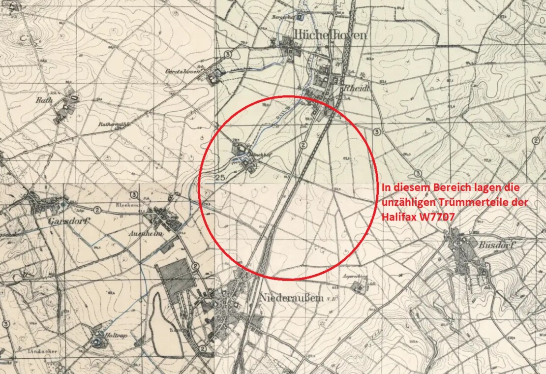 The wreckage of the aircraft was scattered over a radius of up to three kilometres between Niederaussem and Rheidt. None of the entire crew was found; they are still missing today and were later declared dead. All of them received a memorial plaque on the Runnymede Memorial.