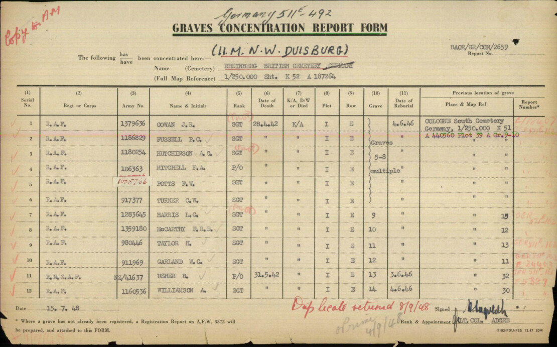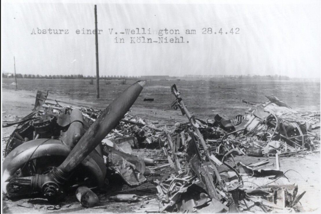The Wellington III, X3639 was fired upon by flak during the attack on Cologne and crashed on fire in Cologne-Niehl, near Neusser Landstrasse in an open field. Four crew members were killed and buried in Cologne's South Cemetery.