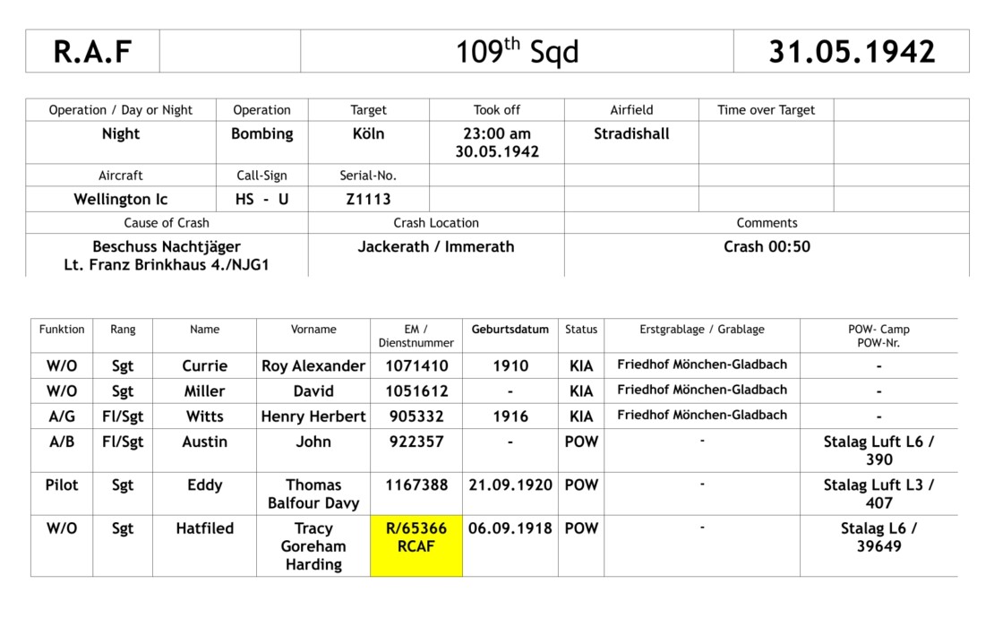 The aircraft crashed in the Jackerath-Titz-Immerath area in an open field, three crew members could only be recovered dead and were buried in the cemetery in Mönchen-Gladbach. Three crew members were able to save themselves by parachute and were later taken prisoner of war by the Germans.