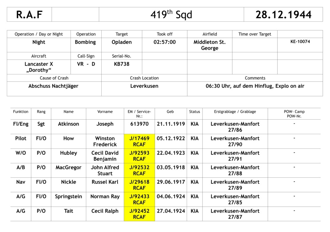 Beim Angriff auf die Bahnanlagen in Opladen am 28.12.1944 waren insgesamt 319 Maschinen beteiligt, von denen zwei auf dem Anflug auf das Bombenziel abstürzten. Es waren die Lancaster X, KB738 der 419th Sqd und die Lancaster X, KB798 der 428th Sqd.