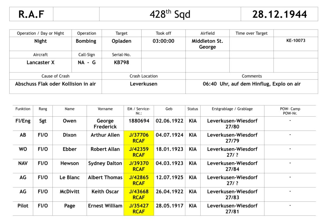 Beim Angriff auf die Bahnanlagen in Opladen am 28.12.1944 waren insgesamt 319 Maschinen beteiligt, von denen zwei auf dem Anflug auf das Bombenziel abstürzten. Es waren die Lancaster X, KB738 der 419th Sqd und die Lancaster X, KB798 der 428th Sqd.