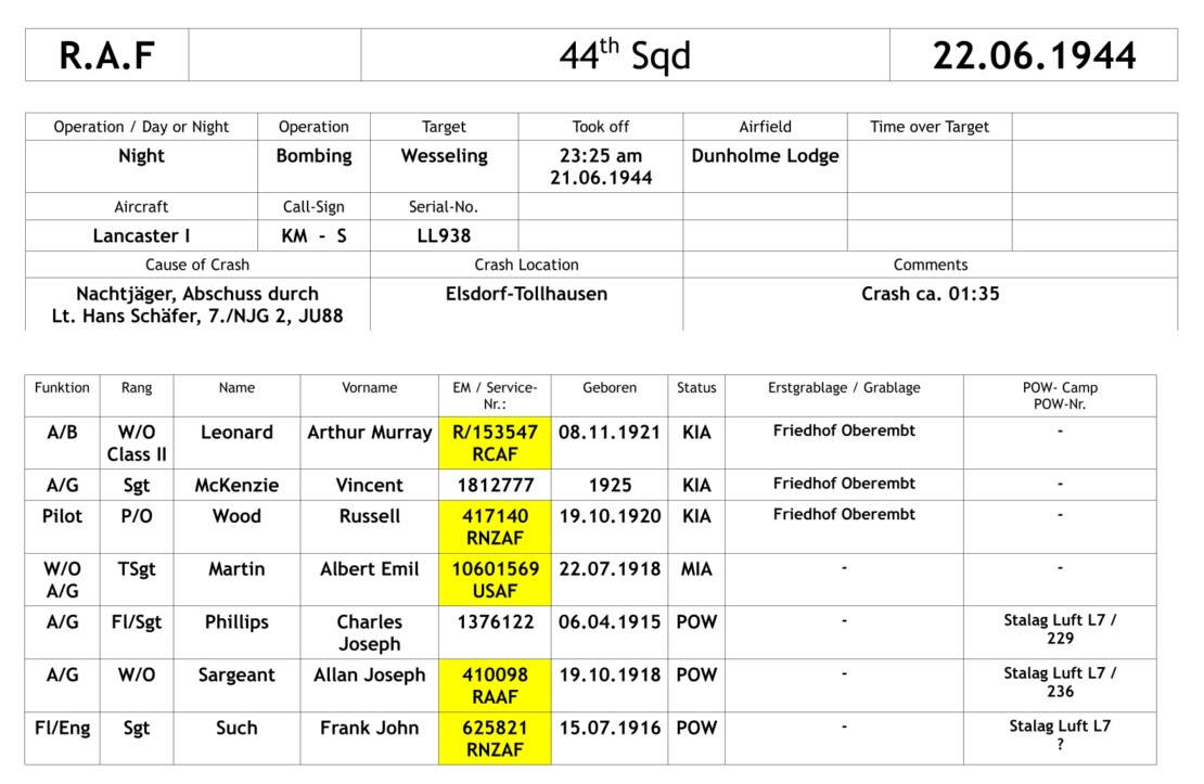 Zuerst fand man die Leiche von Sgt. McKenzie. An Fußspuren im feuchten Untergrund konnte man erkennen, das er noch die Maschine verlassen hatte, jedoch nach etwa 30 Metern wurde er von der Wucht der Explosion getroffen und getötet. P/O Wood´s zerrissener Körper war fast 50 Meter weit geschleudert worden, in weiterer Entfernung wurden weitere Leichenteile gefunden, die ihm zugeordnet wurden. W/O Leonard wurde über einen Kilometer entfernt tot aufgefunden, sein Fallschirm hatte sich nicht geöffnet.
