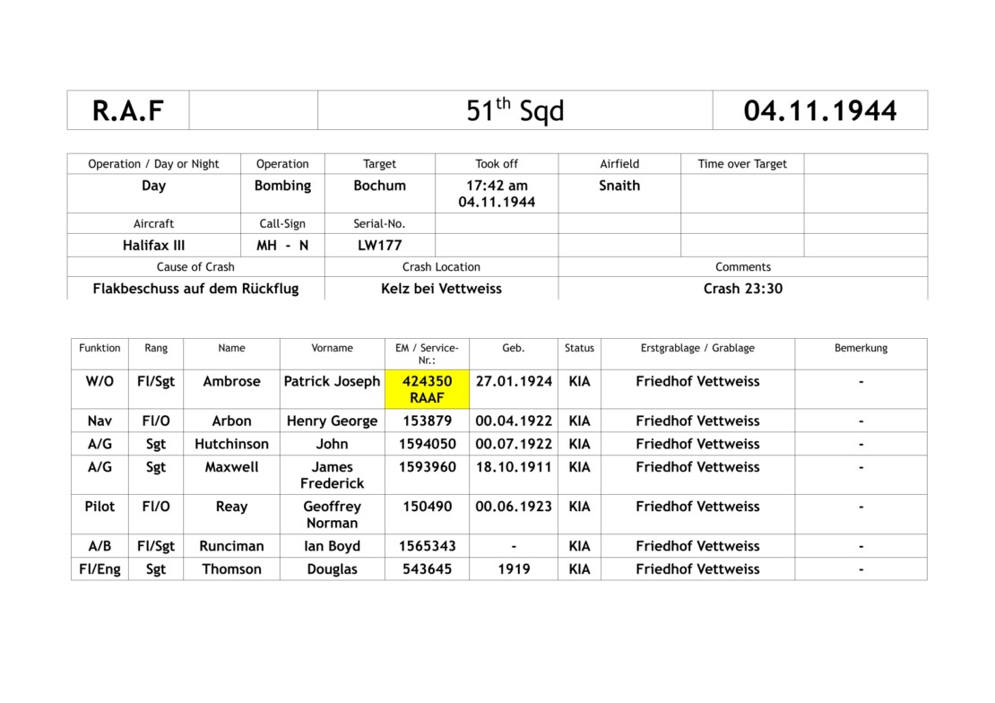 Alle sieben Besatzungsmitglieder fanden dabei den Tod und wurden auf dem Friedhof in Vettweiß beerdigt. Erst im April 1947 wurden die Leichen exhumiert und nach Rheinberg British Cemetery überführt.