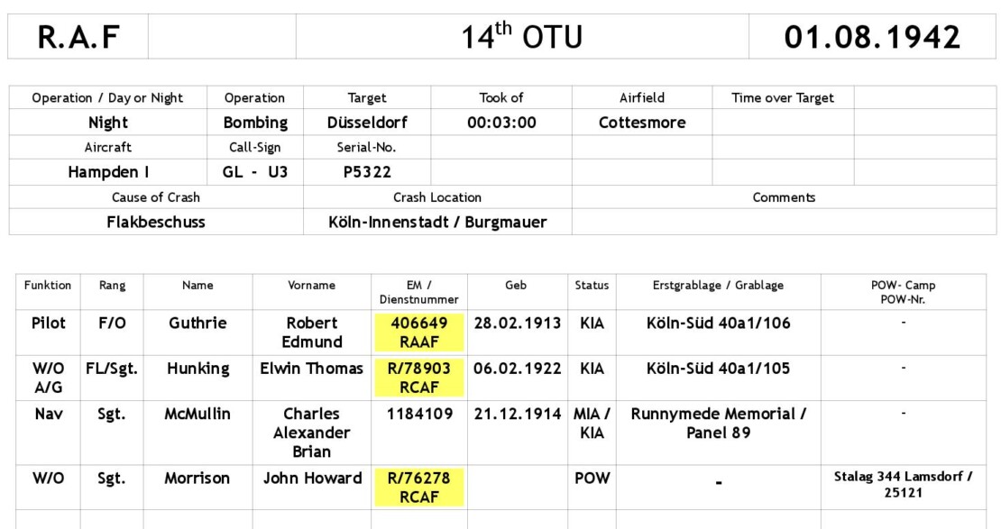 Die Hampden I, P5322 geriet beim Bombenangriff auf Düsseldorf in starkes Flakfeuer der 7. Flak/Div. und stürzte in der Kölner Innenstadt zwischen Burgmauer und Elisenstraße ab.