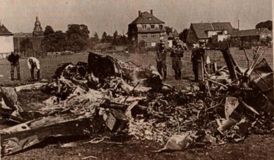 Weitere Trümmerteile der Lancaster. Im Hintergrund die Burg von Efferen , das weiße Haus ist der GREVENHOF, rechts das größere Gebäude der MÜHLENHOF
