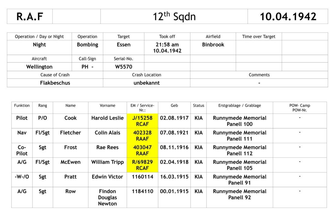 Der Absturz der W5570 ist bis heute ein Rätsel, denn sowohl der Absturzort noch der Verbleib der gesamten Crew sind bis heute bekannt. Als gesichert gilt, das die Wellington W5570 der 12 Sqd am 10.04.1942 um 21:58 von Flugfeld in Binbrook abhob. Sie war eine von insgesamt 254 Maschinen, deren Ziel die KRUPP-Werke in Essen waren.