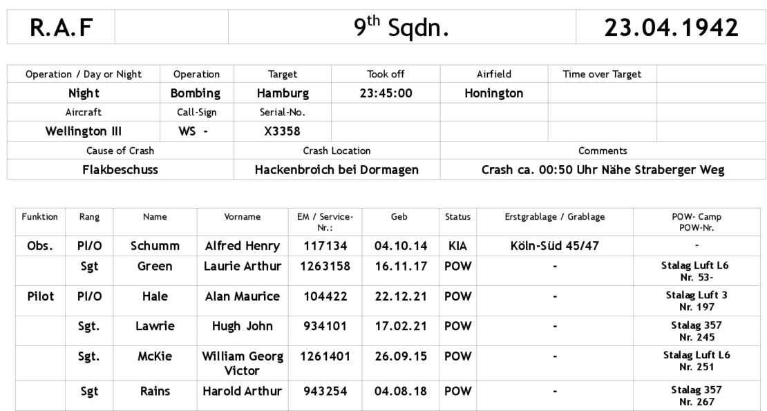 Die Wellington III, X3358 wurde von mehreren Flak-Einheiten beschossen und schwer getroffen. Bis auf den Pilot P/O Henry Alfred Schumm verließ die restliche Crew die Maschine mit dem Fallschirm. Sie zog aus nordöstlicher Richtung kommend eine Schleife um das IG FARBEN-WERK und ging im Gleitflug etwa 100 Meter östlich des Hofes der Gebrüder Philipps in Hackenbroich, am Straberger Weg nieder. Beim Aufschlag explodierte das Flugzeug und ging in Flammen auf.