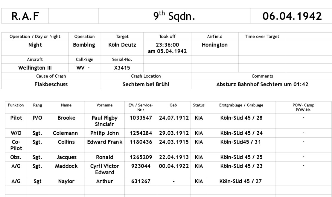 Beim Angriff auf die Bahnanlagen in Köln-Deutz geriet die Wellington III, X3415 in den Wirkungsbereich der Flak, wurde getroffen und stürzte brennend gegenüber des Bahnhofs von Sechtem ins freie Feld.