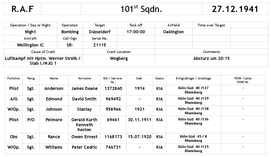 Die Wellington Ic, Z1115 wurde beim Anflug auf Düsseldorf von Flakscheinwerfern der 11.&12. /III/Flak Rgt. 611 erfasst und vom Nachtjäger Hpt. Werner Streib und Feldwebel Ruscher vom Stab I./des Nachjagdgeschwaders 1 (NJG 1) beschossen. Die Maschine geriet in Brand und stürzte im Harbeckerfeld bei Wegberg ab.