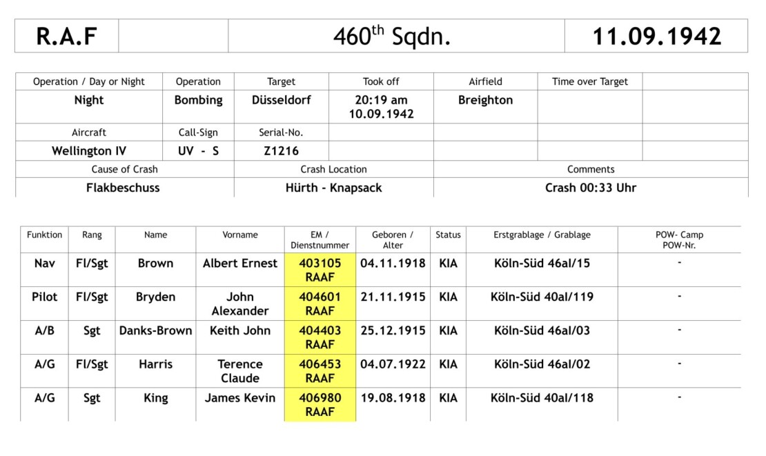 Da die Toten aus mehreren Abstürzen vom 10. und 11.09.1942 rund um Köln ins Reservelazarett in Köln-Nippes gebracht wurden, wurden die tatsächlichen Fundorte der Leichen dort nicht korrekt vermerkt. Daher ist über die Totenbescheinigungen auch kein genauer Fundort und folglich Absturzort zu ermitteln.
