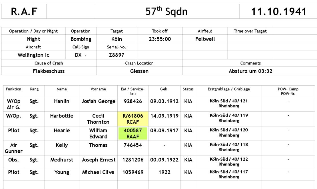 Beim Angriff auf Köln wurde die Wellington Z8897 von den Scheinwerfern der 2./Res. Flakscheinwerfer Abt. 408 aus Köln-Dellbrück erfasst und von der Flak unter Beschuss genommen. Schwer getroffen stürzt die Maschine zwischen Glessen und Fliesteden ab, keiner der Besatzung überlebt. Alle wurden auf dem Kölner Südfriedhof bestattet.