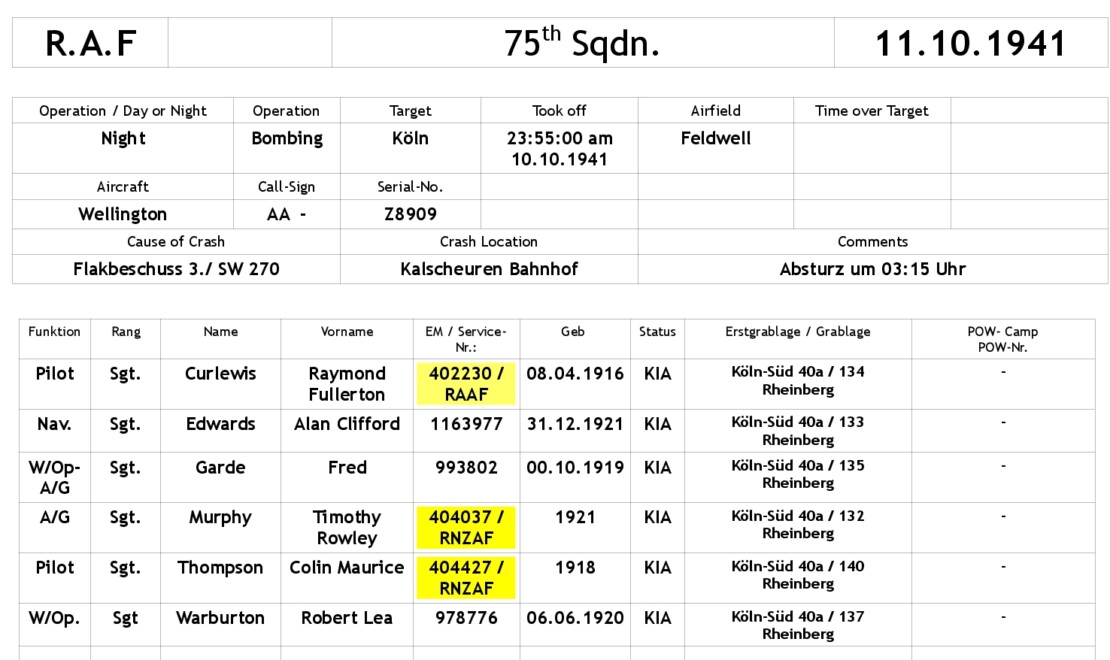 Der Sterbenachweis für den Piloten, Sergeant Raymond Fullerton Curlewis, Mitglied er Royal Australian Air-Force